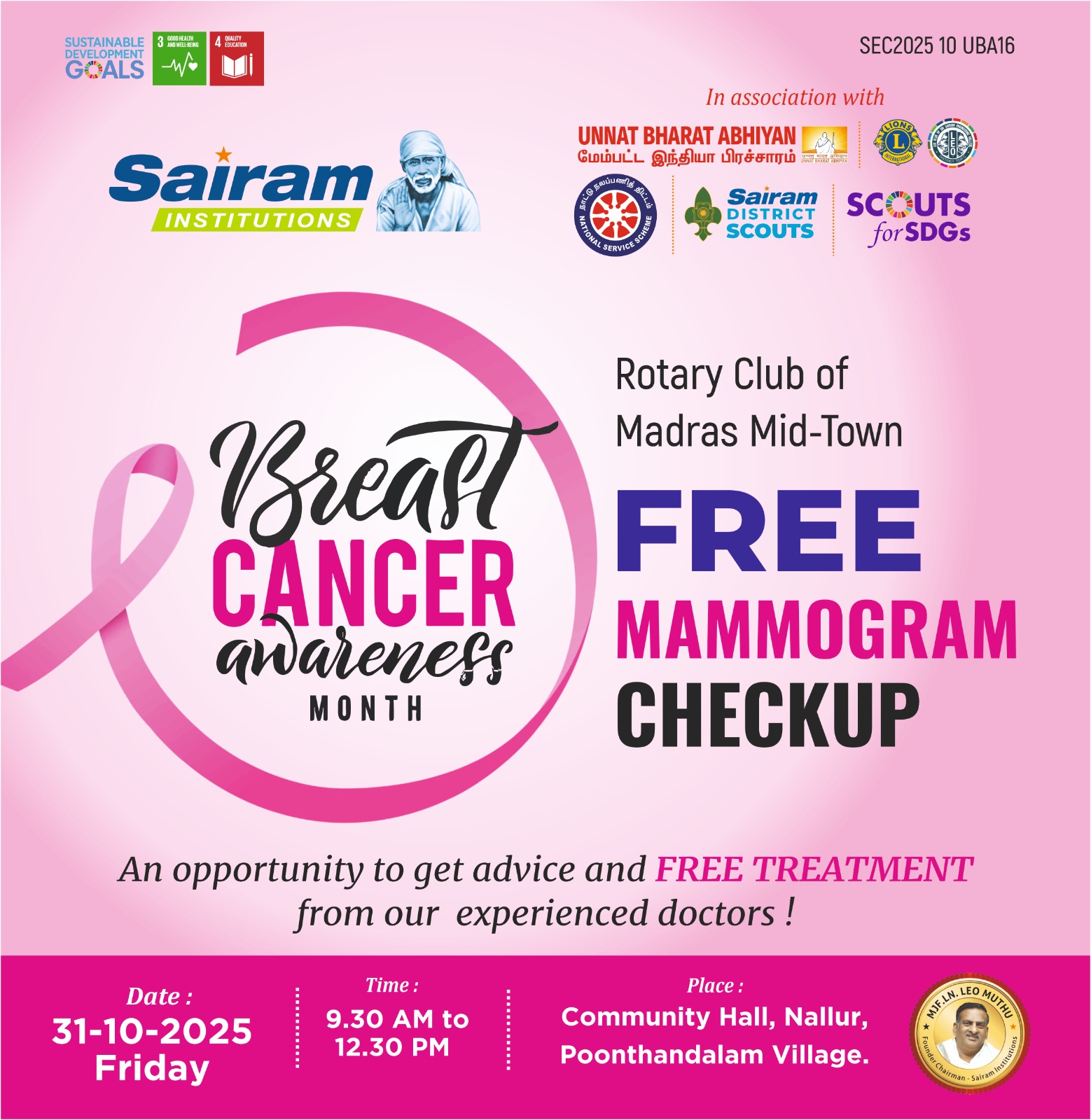 On 31st October 2025, the Unnat Bharat Abhiyan (UBA) Cell of Sairam Institutions organized a Breast Cancer Awareness and Free Mammogram Checkup Programme at Nallur, Poonthandalam Village. This program   .....