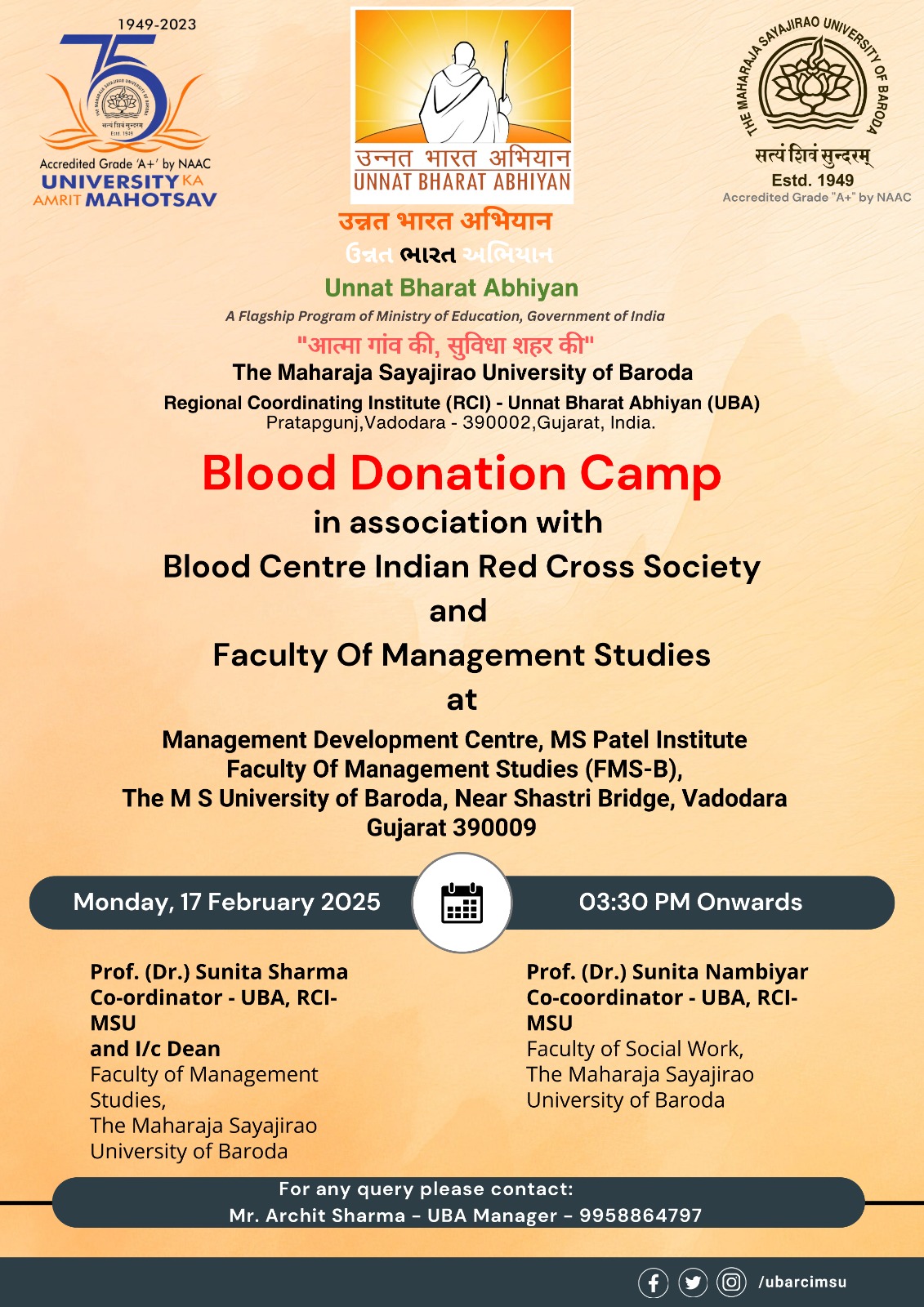 On February 17, 2025, the Lifesaving Impact: Blood Donation Camp was organized at the Management Development Centre, MSU-Baroda, in collaboration with Unnat Bharat Abhiyan, the Faculty of Management S .....