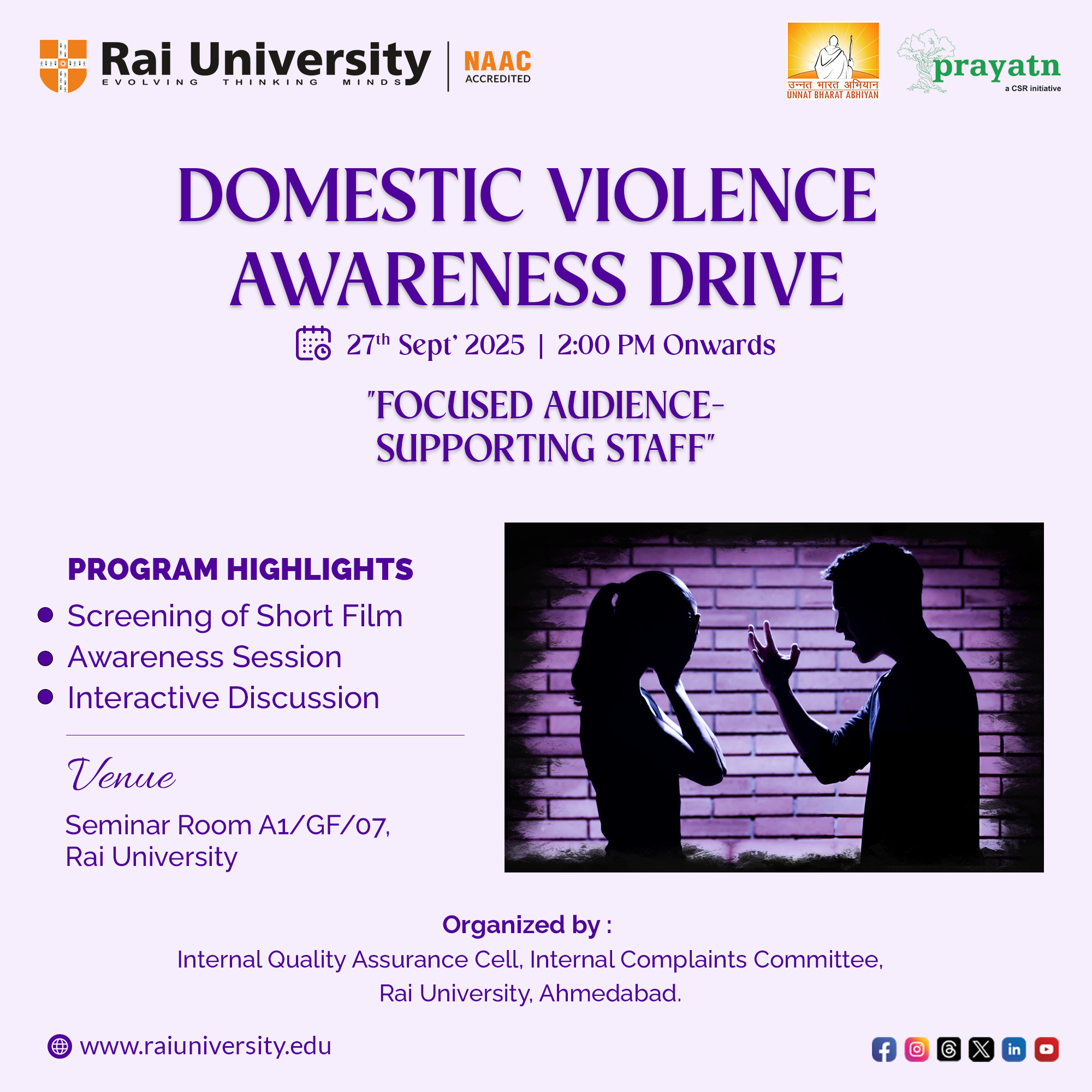 Title of the Activity: Domestic Violence Awareness Drive Organized by: Internal Quality Assurance Cell (IQAC) In Collaboration with: Unnat Bharat Abhiyan (UBA) and Prayatna Club, Rai University Tar .....