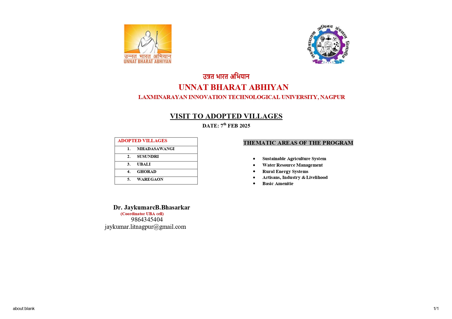 Laxminarayan Innvotion Technological University, Nagpur has adopted five villages from Nagpur vicinity. The coordinator of Unnat Bharat Abhiyan (UBA) LIT University (Dr. J.B. Bhasarkar), and Teacher c .....