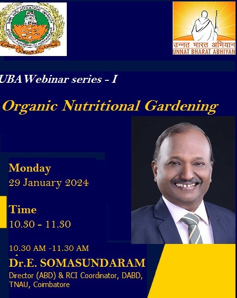 UBA Webinar on "Organic Nutritional Gardening" by Dr.E.Somasundaram, Director (ABD) & RCI Coordinator, DABD, TNAU, Coimbatore Hosted by The Director (ABD), TNAU https://dabdtnau.webex.com/dabdtnau .....